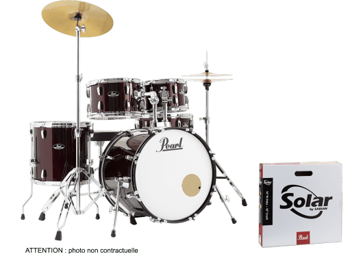 - Accessoires : pédale de grosse caisse P-50 + siège D-50 + set de cymbales Sabian Solar (hi-hat 14" et crash/ride 16") + paire de baguettes + housse de baguettes