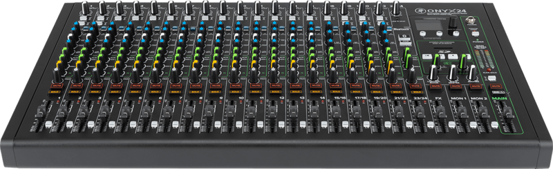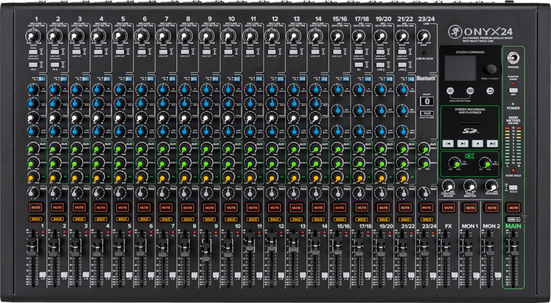 - Contrôle de volume, panoramique, 2 départs Aux, 1 départ FX, Mute, Solo et témoin de signal par tranche